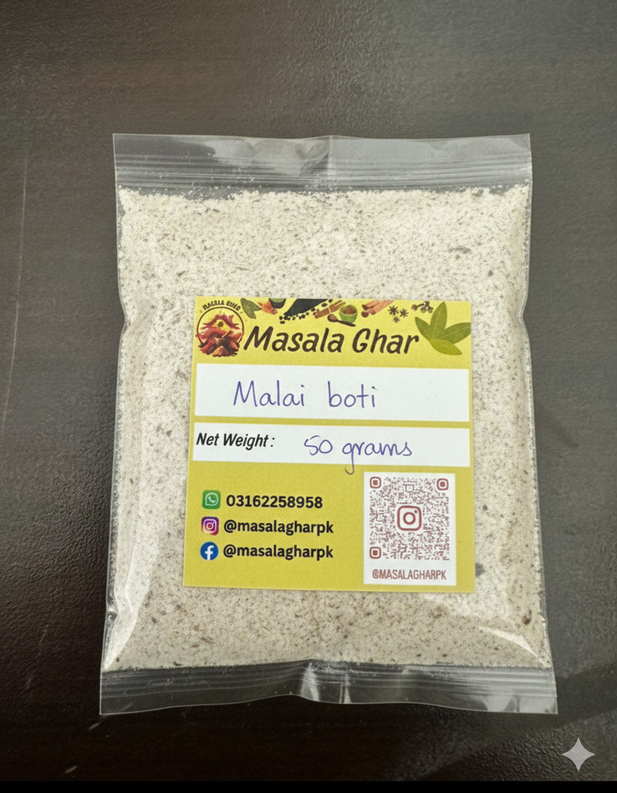 Create succulent, creamy, and flavorful Malai Boti at home with Masala Ghar Malai Boti Masala. This special blend of spices enhances chicken with rich creaminess, aromatic flavor, and mild spice, giving your skewered chicken that restaurant-style melt-in-the-mouth taste.